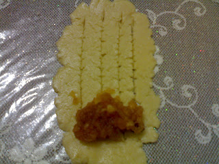 - Üçte ikilik kısmına boylamasına, bıçakla çizikler atın. Boş kalan kısma elmalı içden koyup sarın. Hafifçe büküp ay şekli verin.
