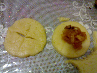 - Yuvarlak şekli vermek için hamuru 0.5 cm. kalınlıkta açın. çay bardağıyla kesin. Bir parçanın ortasına elmalı iç koyun. Diğer parçanın ortasına artı şeklinde kesik atıp ilk parçanın üzerine kapatın. Kenarlarını çatalla hafifçe bastırın.