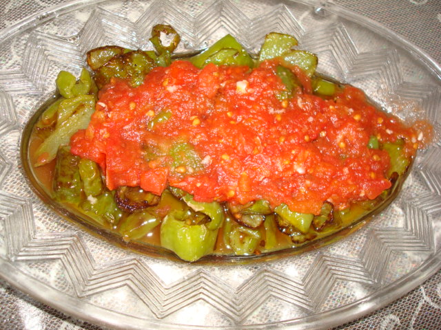 YAPILIŞI:Biberleri doğrayın kızgın bol yağda kızartın servis tabağına alın üzeri için bir tavada rendelenmiş domatesleri koyup pişirin kaynamaya başlayınca içine sarımsak rendeleyip biraz pişrip biberlerin üstüne döküp servis yapın.AFİYET OLSUN..