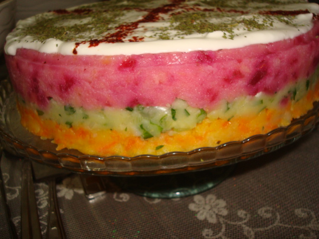 kırmızı kat için üçüncü patatesin içine pancar turşusunu rendeleyin,sıvıyağ,limon suyu ve tuzu ekleyip karıştırın.kelepçeli kalıbın içini yağlayıp önce kırmızı patatesi(pancarlı olanı)üstüne yeşil katı hafif hafif elimizle bastırarak yayın üzerine turuncu katı(havuçlu karışım)elimizle bastırarak yayın 1 saat buzdolabında dinlendirin servis yaparken servis yapacağımız kaba ters çevirip kelepçeli kalıbı çıkartıp üzerine sarımsaklı yoğurt döküp servis yapınız.