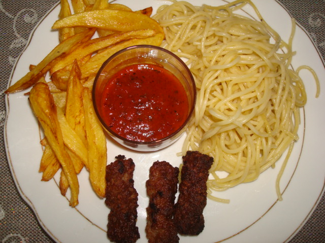 YAPILIŞI:SOS:Salçayı çok az sıvıağda kavurup içine baharatları atıp karıştırın üzerine çok az sıcak su ekleyip bir taşım kaynatın koyu kıvamda olacak..patates ve izmir köfteleri kızgın yağda kızartın. makarna ile birlikte servis yapın...AFİYET OLSUN....