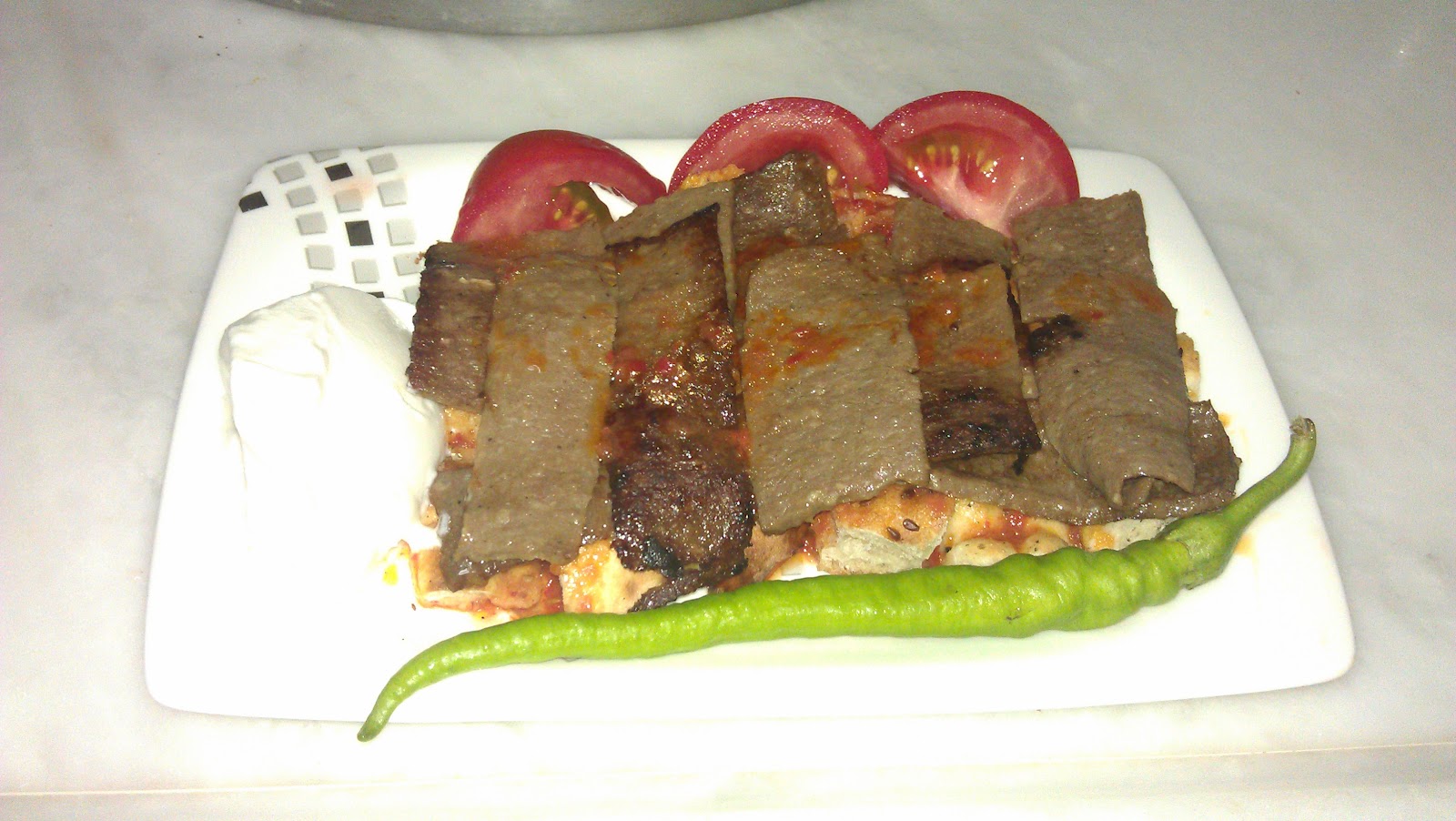 Bayat pideleri küp şeklinde kes.Fırında kızarana kadar pişir.1 su bardağı et suyunu iyice kaynat sıcak pidelerin üzerine dök.Ayrı bir tavada salçayla tereyağını karıştır,1 çay bardağı su koy,kaynasın.Ayrı bir tavada dönerleri pişir.Isladığın pideleri servis tabağına diz,üzerine salçalı sostan gezdir,dönerleri üzerine diz, sostan dönerlerinde üstüne 2 kaşık dök.Tabağı dmates,biber,yoğurtla süsle,servis yap.Afiyet olsun.