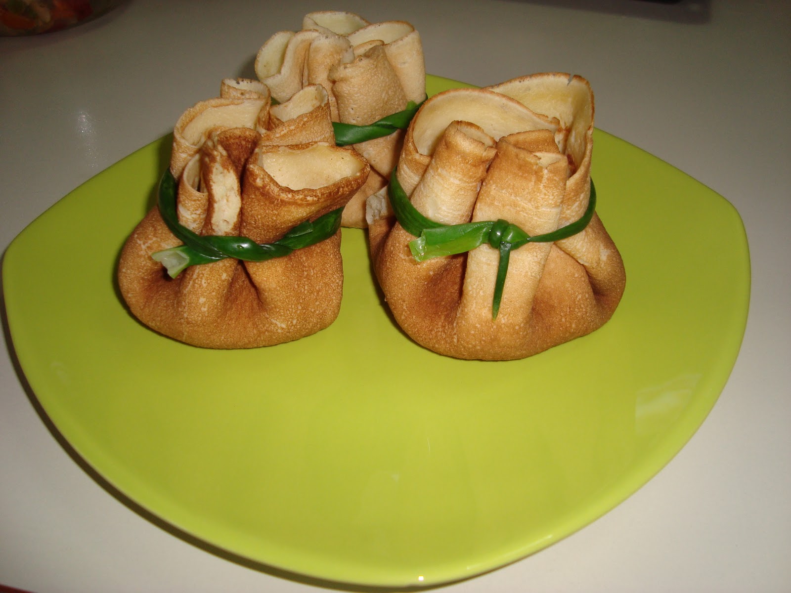 YAPILIŞI:Kuşbaşı etlerini tavaya mısır özü yağı koyup soteliyoruz.üzerine soğan sarımsak,biberleri ve salçayı ilave edip biraz daha kovurup yeterince su ,tuz karabiber ilave ediyorz.krep için:un ,süt,yumurtayı koyup çırpıyoruz tuzuda ilave edip karıştırıyoruz sonra tavaya çok az yağ döküp yayıyoruz üzerine orta boy tava için bir kepçe krep harcından döküp hamuru yayıyoruz orta ateşte kızarına kadar pişiriyoruz.Tavuklu harçları kreplere paylaştırıp.kreplere bohça şeklini veriyoruz.Yeşil soğanları sıcak suyun içine batırıp çıkartıyoruz.kreplerin uçlarına yeşil sogan yapraklarıyla bağlıyoruz.fırın tepsine dizip üzerine kaşar peynir rendesi serpip kaşarlar kızarın kadar pişiriyoruz..