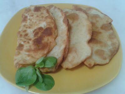 Bütün malzemeleri karıştırıp,yoğur.Yoğurduğun hamuru ceviz büyüklüğünde parçalara ayır,yuvarla.Merdane yardımıyla ceviz büyüklüğündeki hamurları tabak büyüklüğünde aç.İçlerine peynir koyarak yarım ay şeklinde kapat,parmaklarınla iyice kenarlarına bastır.Kızgın yağda kızart.Afiyet olsun.